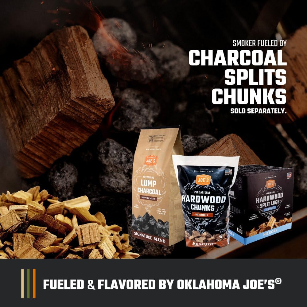 This Oklahoma Joe’s® Grill is built for pitmasters who want greater control, more capacity, and consistently even results for barbecue, smoking meat, and diverse outdoor cooking in the backyard. This grill with offset smoker uses charcoal & hardwood splits or chunks to deliver authentic BBQ flavor through indirect heat, enhanced by reverse flow technology that circulates smoke and heat evenly across the cooking chamber. Removable baffles and adjustable smokestack positions let you switch between reverse flow and traditional offset smoking, giving you the flexibility to fine-tune temperature control for different cuts and cook styles. Since 1987, Oklahoma Joe’s has been pioneering the craft of live fire outdoor cooking with a broad selection of BBQ smokers, combo grills, charcoal grills, portable grills, drum smokers, auto-feed charcoal smokers and grills, offset smokers, reverse flow offset smokers, and a range of wood and charcoal fuel, including lump charcoal, charcoal briquettes, wood chips, and wood chunks. Oklahoma Joe’s also offers a full line of grilling and smoking accessories, from BBQ prep and cooking to cleanup. Whether you’re searing a steak to perfection or throwing down a feast for a crowd, Oklahoma Joe’s has everything you need to achieve Real. Smoke. Flavor.